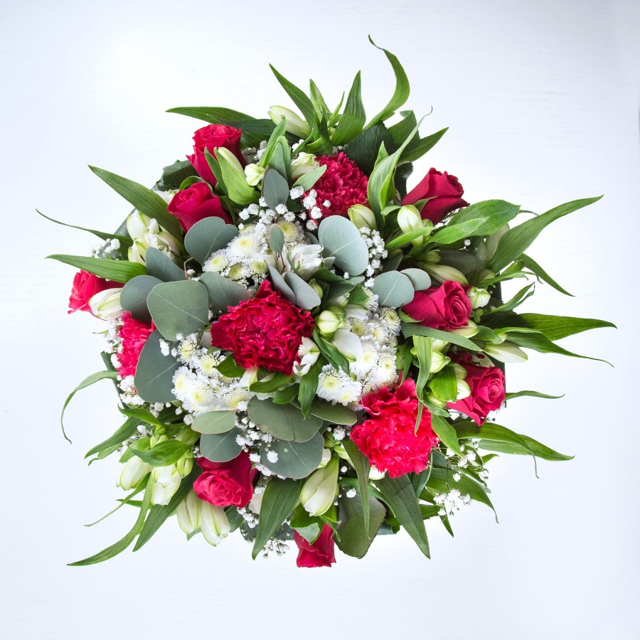 Experience the opulent beauty and uniqueness of our exquisite bouquet. Showcasing rich red roses and vibrant carnations, complemented by sweet white chrysanthemums and delicate gypsophila. Finished with elegant white alstroemeria and lush aspidistra leaves for a luxurious touch.
