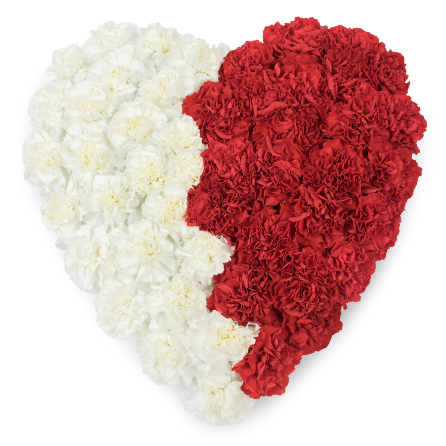 Our heart-shaped bouquet is a beautiful expression of sympathy and love, featuring a delightful mix of white and red carnations. Each bloom is arranged with care to create a stunning visual impact.