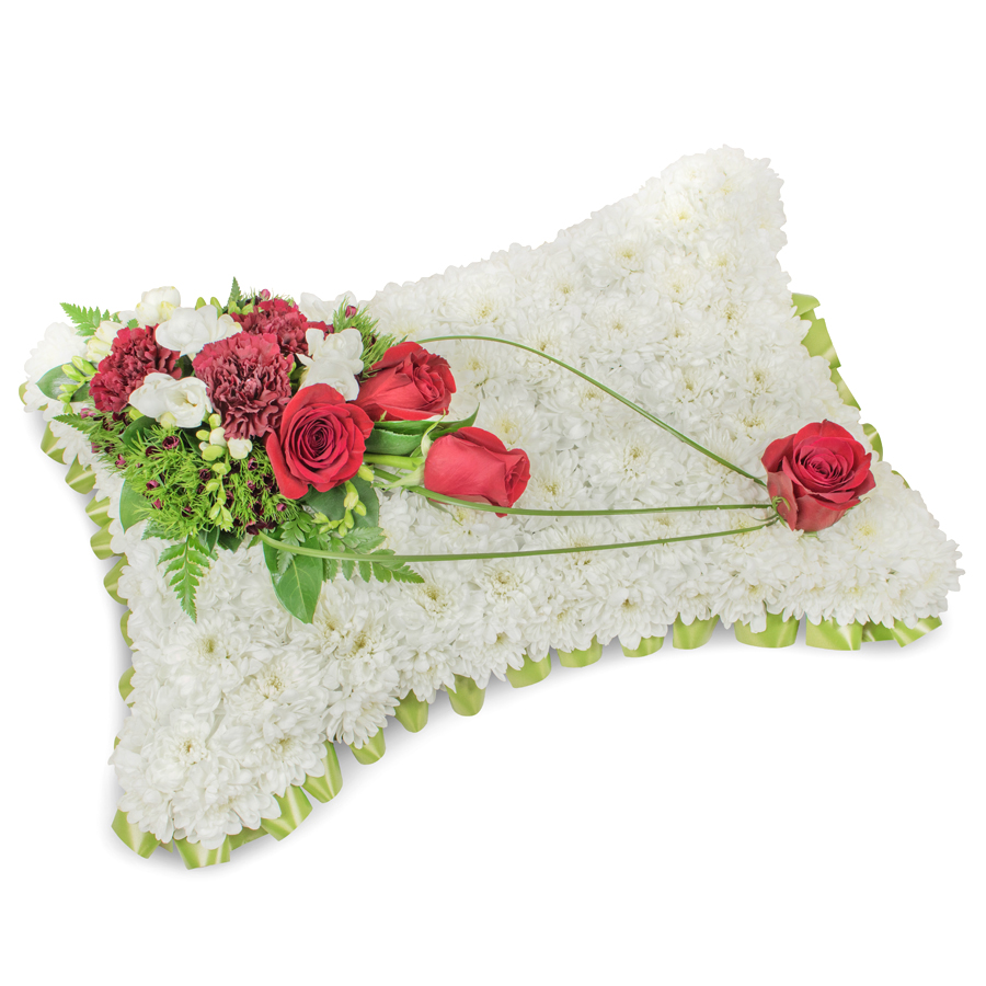 Express your sincere condolences with our timeless arrangement featuring white chrysanthemums, vibrant red roses, white freesias, dark red carnations, delicate dianthus, and elegant bear grass.